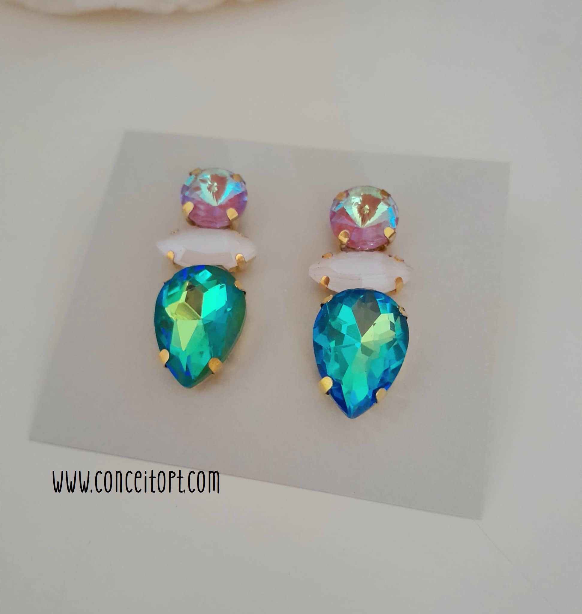 Estes brincos combinam cristais facetados em tons vibrantes e iridescentes, montados em estruturas elegantes que brincam com a luz e o movimento. Cada par é uma pequena arquitetura de brilho, onde o contraste entre formas e cores transforma o acessório em protagonista.